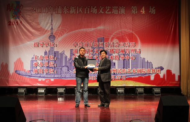 活动开始前申港街道党工委委员、纪工委书记郭根明上台致辞,我校党委副书记、副校长黄晞建上台赠与云南楚雄彝族自治州民族艺术剧院歌舞团百年校庆纪念品,对云南的艺术家来到上海致以热烈的欢迎和诚挚的祝福。