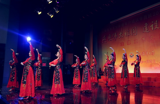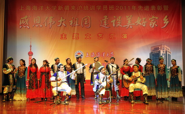 文艺汇演在电视片“沪疆共建谱新曲”---上海海洋大学新疆喀什地区来沪培训班工作巡礼的播放中拉开帷幕。 97名新疆喀什地区来沪培训学员在我校为期一年的理论培训学习虽告一段落,这对每位学员来说,既是一段充实而又难忘的美好时光,又是有着许多震撼和感动的日子。2011年岁末,培训班全体学员在领队、辅导员的精心指导下自编、自导、自演了一台文艺汇演,他们用曼妙的舞姿来表达培训中收获的喜悦和精彩,用动听的歌声表达对党对祖国的感恩之情。