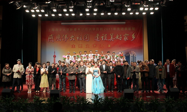 2012年1月4日下午,上海海洋大学新疆喀什地区来沪培训学员班表彰先进暨“感恩伟大祖国,建设美好家乡”主题文艺汇报演出在我校大学生活动中心报告厅隆重举行。我校副校长封金章,浦东新区合作交流办主任徐才、副主任奚晓龙、副处长蒋晓峰应邀出席会议。我校相关部门负责人、各学院部分师生和后勤员工观看了精彩的演出,共同感受民族文化,体验西部风情。