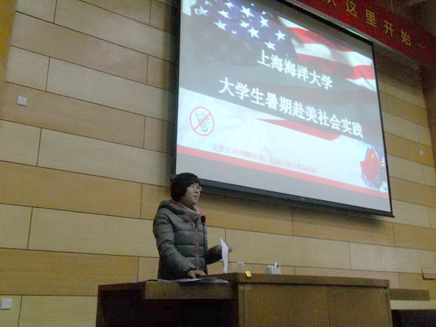 2月21号下午,海洋科学学院二、三年级300多名学生于1117教室聆听了美邦国际2012年暑期赴美带薪实践宣讲会。报告由中国对外友好合作服务中心美邦国际上海办公室主任陈果女士主讲,就业办徐璐老师主持本次宣讲会。