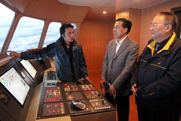 潘校长陪同张贵龙副主任参观捕捞与航海模拟器实验室