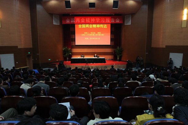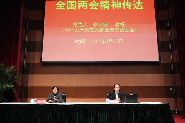 3月27日下午,我校在图文信息中心104召开全国“两会”精神传达专题报告会。全国人大代表、民建中央委员、民建上海市委副主委张兆安教授应邀前来传达“两会”精神,校领导和中层干部,各学院代表以及我校民建支部成员参加了报告会。报告会由校党委书记虞丽娟主持。