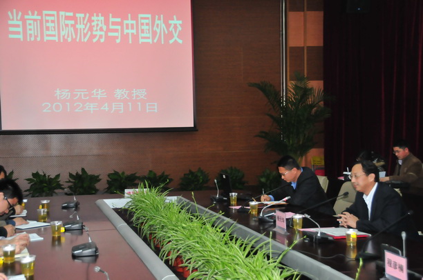 聘任仪式结束后,杨教授就当前国际形势与中国外交做了专题报告。他首先分析了当前国际形势中经济全球化、国际关系民主化、安全危机的复杂化等五大特点。其次他言简意赅地介绍了中国外交方针,总结为以下四点:发展中国家是基础,大国是重点,其中重中之重视与美国之间的外交关系,周边是关键,多边是舞台。最后,杨教授就当前热点问题,如叙利亚、朝鲜、东海油气、日本、南海等问题进行分析,认为当前中国面临的外交形势严峻,存在很大的挑战,中国要抓住机遇,为国内建设营造一个和平的外部环境。