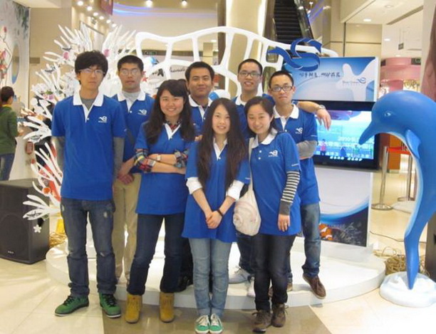 2012年4月15日,我校水产与生命学院常馨芝等8名同学参加在南京西路818广场举办的“心手相连呵护蔚蓝”大型公益活动。