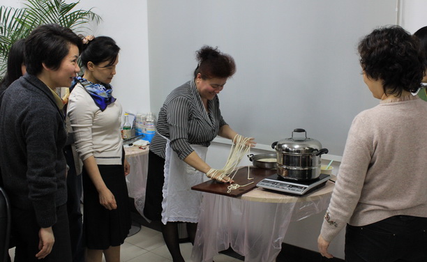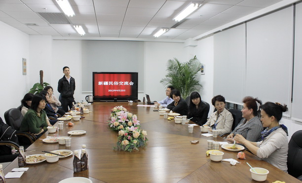 本次活动以民族风情展示、民族风俗交流为主题。分会特别邀请了外语学院2011级英语专业新疆班的特聘辅导员、外语学院院长助理莫老师参与联谊会活动。莫老师详细介绍了维吾尔族的文化、信仰、民间风俗以及喀什地区独有的特点,别具风情的民族文化激起了大家对新疆民俗的极大兴趣,为了让大家有更为直观的感受,莫老师为大家展示了新疆美食的烹饪过程并现场为大家做了“手抓饭”、“新疆拉条”等特色美食,许多老师在看过莫老师的示范后亲自上场,体验如何把新疆美食做得更有新疆味道。在欢声笑语中,大家交流经验、品尝着美食,现场一派其乐融融的景象。通过这次活动大家达成了共识,以后要更好地利用联谊会这个平台,交流信息,愉悦身心,让工作之余的生活更加丰富多彩。