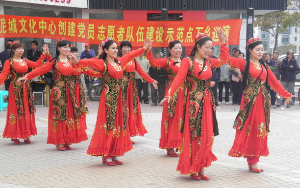 在五一前后,学员们积极参加各实习点开展的文化下乡文艺汇演活动,利用闲暇时间,米热古力老师为学员指导,得到各单位领导、同事及当地百姓好评,其中以书院镇、老港镇、泥城镇最为突出。书院镇玉素甫·艾合麦提与玛依努尔·阿不都热依木学员放弃双休日参与单位同事下村表演,为书院镇“我们的家园”送戏下乡演出活动增添了一道独特的风景线,送去了具有新疆特色的民族舞蹈《新疆维吾尔姑娘》,受到当地百姓热烈欢迎。在表演结束村民们纷纷向两位学员了解新疆现状,并现场学习一些舞蹈动作,近距离接触新疆文化,对新疆有了进一步的认识。目前两位学员在实习单位的安排下依然活跃在演出场上,每天平均演出2到3场。在老港镇实习的9名学员参加了该镇组织的《新青年·新风尚》才艺选拔赛,从30个节目中脱颖而出。其中《美丽至上》、《新疆山水美》获得三等奖的佳绩。泥城镇实习学员自主编排的新疆舞蹈《古丽》,在每场的演出中都赢得村民的阵阵掌声。