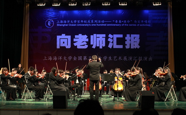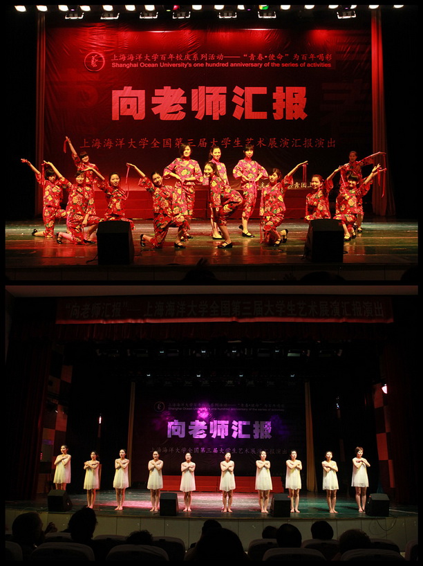 “向老师汇报”上海海洋大学全国第三届大学生艺术展演汇报演出于5月8日在学生活动中心报告厅举行。校长潘迎捷教授,党委副书记吴嘉敏教授,党委副书记、副校长黄晞建教授、校长助理吴建农教授、校艺术团指导老师和全体老师们出席了汇演。