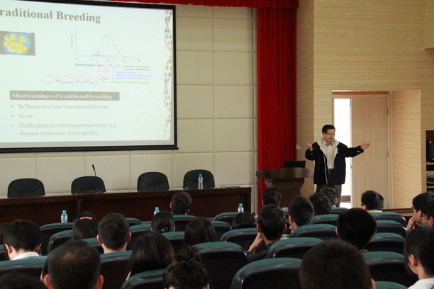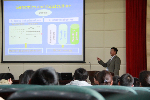 刘占江教授教授报告的主题为“Genome Infrastructure for Resolving Major Challenges Facing the Catfish Aquaculture Industry”,以斑点叉尾鮰基因组学研究为例,深入剖析水产动物基因组基础研究面对的十大挑战,提出未来水产生物基因组学的研究方向和解决问题的思路。岳根华教授报告的主题为“Ways Towards Marker/Genomics-assisted Breeding”。岳教授从自己的主要研究工作出发,介绍了基因和基因组作为一种工具在水产动物育种上的优势。并通过与常规育种的比较,提出“常规育种为主,基因育种为辅”的现代生物育种流行趋势。报告结束后,两位教授与学校师生进一步就基因组学在遗传育种各方面的应用问题进行了交流讨论,详细回答了师生们提出的学术问题。