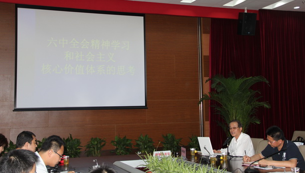 聘任仪式结束后,陈锡喜教授就六中全会精神和社会主义核心价值体系建设做了专题报告。他简要介绍了六中全会《决定》主要精神,在关于社会主义核心价值体系建设问题上,必须坚持马克思主义的指导地位不动摇,指出马克思主义是国家文化“软实力”建设的“提升机”,是社会发展进步的“方向盘”,是文化繁荣发展的“推进机”,是社会转型的“稳定仪”。在两个多小时的报告中,陈老师结合自己多年来的研究和思考,旁征博引,对问题的分析鞭辟入里,总结深刻透彻,提出了很多创造性的见解,融思想性、学术性于一体,视野开阔、立意高远,彰显了大家的风范和学识魅力,赢得了阵阵掌声。