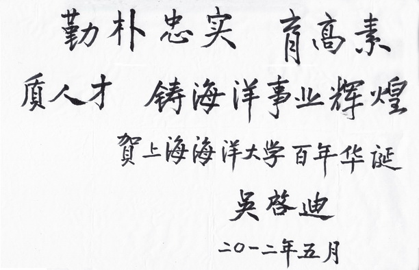 在上海海洋大学喜迎100周年校庆之际,全国人大常委会委员、原教育部副部长吴启迪为我校亲笔题词:“勤朴忠实 育高素质人才 铸海洋事业辉煌”,祝贺我校建校100周年。