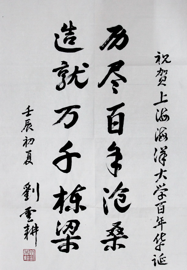 在上海海洋大学喜迎100周年校庆之际,上海市人大常委会主任、党组书记刘云耕为我校亲笔题词:“历尽百年沧桑 造就万千栋梁”,祝贺我校建校100周年。