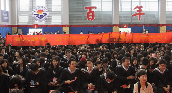 毕业典礼现场,记录大学四年生活点滴的视频“岁月如歌”唤醒了每位毕业生内心深处的记忆,首批进驻临港校区的2008级毕业生即将在母校百年华诞之际,带着“勤朴忠实”的校训精神,追逐梦想,扬帆远航。