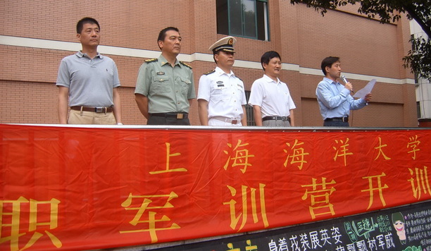 6月19日上午9时整,上海海洋大学高职学院2010、2011级学生军训开训仪式在学校操场隆重举行。出席开训仪式的领导及嘉宾有某部副参谋长徐某、校武装部王琼副部长、高职学院院长成长生、学院党总支书记林高。仪式由高职学院副院长张云主持。