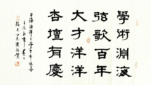 在上海海洋大学喜迎100周年校庆之际,中共十六届、十七届中央委员、中央人民政府驻澳门特别行政区联络办公室主任、我校1976届水产品加工专业白志健校友为我校校庆题词:“学术渊海 弦歌百年 大才洋洋 杏坛有庆”,祝贺我校建校100周年。