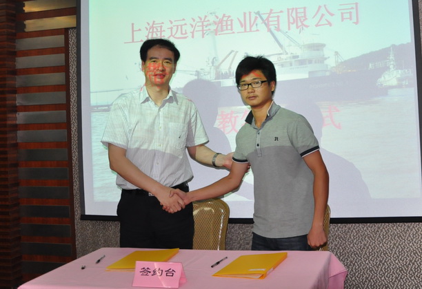 2012年7月11日,我校与上海远洋渔业有限公司在上海水产集团510会议室举行企业导师签约仪式。会议由上海水产集团工会主席尹协仁主持。上海水产集团副总裁唐文华,上海开创远洋渔业有限公司党委书记、总裁谢峰,上海金优远洋渔业有限公司董事长沈辉、总经理周金官、人事部经理陆稔,上海海洋大学副校长黄硕琳,上海海洋大学研究生部部长施志仪,上海海洋大学海洋科学学院院长许柳雄、院党委书记许四杰、副院长陈新军、办公室主任沙锋,此外,还有上海远洋渔业有限公司的石国臻、孙开华、黄健以四名专业学位研究生参加了会议。