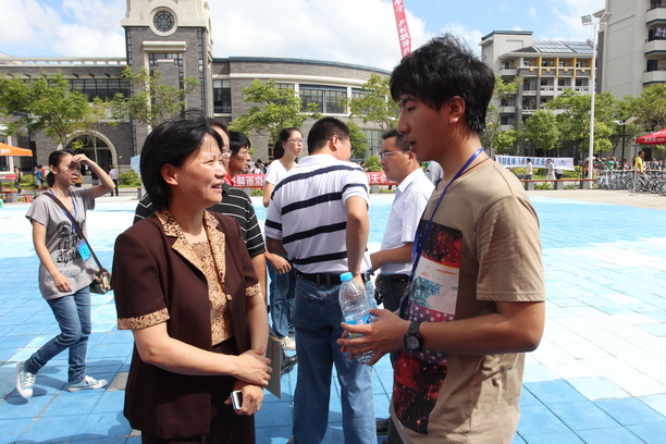 2012级的新生志愿者与视察迎新工作的虞丽娟书记交谈志愿服务感受