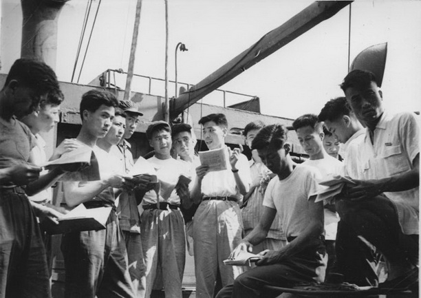 1952年,为满足学生教学实习的需要,华东水产管理局从上海水产公司调拨270总吨的“水产号”渔船给学校作实习渔船,供海洋渔业及航海专业学生实习。后因“水产号”船龄过长报废,水产部又拨专款建造两艘185总吨250马力实习渔船“发奋号”和“图强号”。以下图片均为捕55级学生在校“水产号”渔轮上的实习。