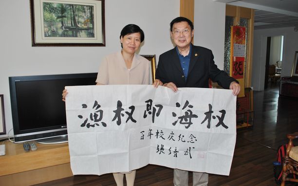 校党委书记虞丽娟向张绪武先生介绍了学校100周年校庆的筹备工作,提出学校百年校庆之际需要饮水思源、继承创新,更好地谋划未来发展,并邀请张绪武先生出席百年校庆庆典。宾主双方一同回忆了张謇于20世纪初为“护渔权,张海权”,提出“渔界所至,海权所在也”等主张,并于1904年向清廷提议创办水产学校(上海海洋大学前身)。张謇渔业思想的核心可以概括为“渔权即海权”,在我国海权思想发展史上具有里程碑意义。张绪武先生为学校题写“渔权即海权”,以反映和纪念张謇这一核心思想。学校将在校园内立“海权石”,予以传承发扬。