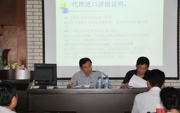 此次培训由上海市乾锦昊进出口有限公司担任主讲。杨老师系统介绍了代理进口业务的流程,重点介绍了包括CIF\CIP\FOD等在内的贸易业务术语定义和使用范围,以及付款方式中电汇T/T和信用证L/C的定义、使用范围和操作风险。王总经理对流程的各个环节做了详尽的说明,包括国外供应商资质的鉴定和产品的选择、价格核算、验货报告、不能免税的进口商品名录、交货注意事项、设备验收和索赔程序等。鉴于公司与学校多年的合作与了解,王总穿插了学校购买高压灭菌锅等实验器材的实际案例并进行了分析。报告言语生动,精彩纷呈。