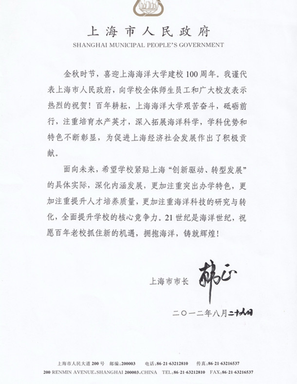 韩正市长在贺信中说,百年耕耘,上海海洋大学艰苦奋斗,砥砺前行,注重培育水产英才,深入拓展海洋科学,学科优势和特色不断彰显,为促进上海经济社会发展做出了积极贡献。