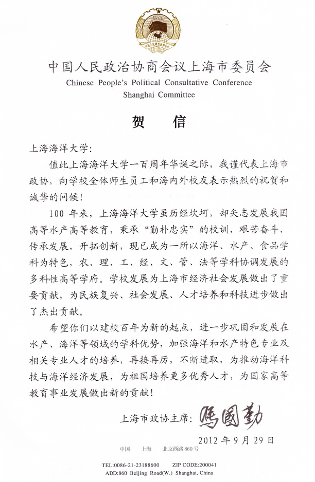 在上海海洋大学喜迎100周年校庆之际,上海市政协主席冯国勤致信我校,代表上海市政协向学校全体师生员工和海内外校友表示热烈的祝贺和诚挚的问候。