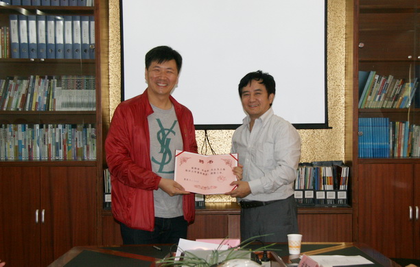 随后,郑卫东处长介绍了宋嘉桓董事长与田新民教授的学习、工作经历及主要成就,并宣布聘任两位为我校兼职教授的决定;黄晞建副书记、副校长对宋嘉桓董事长与田新民教授加盟我校表示热烈欢迎,代表学校向其颁发了兼职教授聘书,并对宋嘉桓董事长的慷慨捐赠表示了感谢,希望俊开公司能继续加强与我校的合作,为我校的繁荣发展作出更大的贡献。