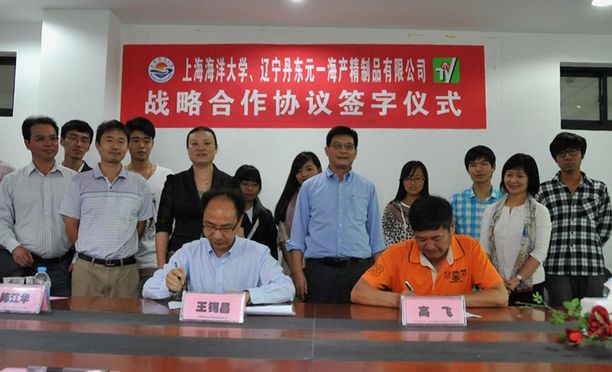 上海海洋大学--辽宁丹东元一海产精制品有限公司战略合作签约仪式暨捐赠仪式于10月14日下午在食品学院A209会议室举行。上海海洋大学副校长程裕东,丹东元一海产精制品有限公司总经理高飞、副总经理曾毅、厂办主任许化玲,食品学院党委书记陈江华、院长王锡昌教授、副院长李燕教授、副书记蔡闯、院办主任吴建中以及部分教师和学生代表参加了仪式,签约仪式由陈江华书记主持。