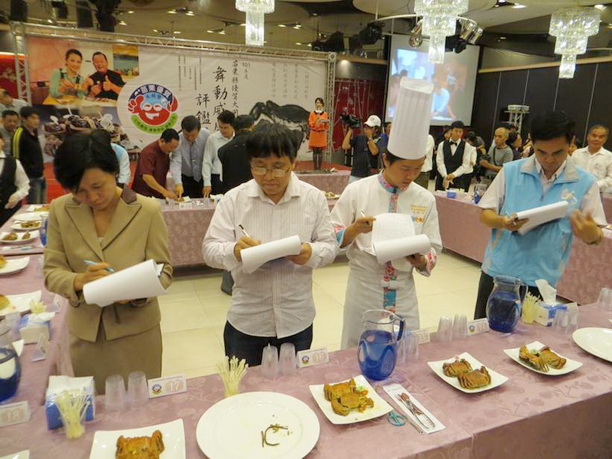 金秋十月,海峡两岸普照和煦阳光。10月15日,第一届苗栗县优质大闸蟹品鉴会在台湾苗栗县东北角酒店隆重举行,由我校党委书记虞丽娟教授、水产与生命学院王武教授和成永旭教授,以及台湾行政院农业委员会副主委胡兴华、渔业署长沙志一、苗栗县政府农业处副处长林澄清和美食大厨共同组成苗栗县优质大闸蟹评审团,共同评鉴由我校专家团队技术辅导的苗栗大闸蟹。