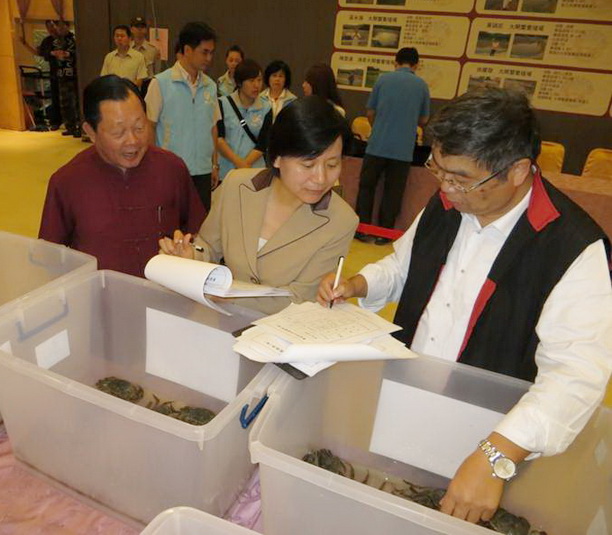 苗栗县刘政鸿县长在一旁兴致勃勃地观看虞丽娟教授、王武教授为参赛大闸蟹外观评分