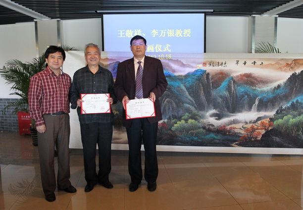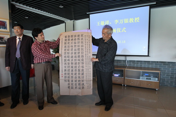 黄晞建副书记向王敬祥(右一)、李万银(右二)两位教授颁发捐赠证书,背景为王敬祥院长捐献作品之一