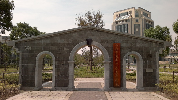 第三道门,寓意着学校1947年在上海复校,并被命名为上海市立吴淞水产专科学校。校牌为老校长侯朝海笔迹。其右侧有一座纪念碑,记载抗战胜利后,侯朝海等竭力筹措在上海复校的事迹。