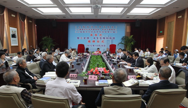 校长潘迎捷先发表讲话,认为《上海海洋大学百年志》、《上海海洋大学传统学科、专业与课程史》、《上海海洋大学百年科技成果汇编》(简称三书)首发,及三史馆和水生生物科技馆(简称两馆)揭牌,是学校迎接百年校庆的重大文化工程。这些工作集中了大家智慧,凝聚了几代人工作成果,众多离退休老教师和广大教职员工,积极提供材料和线索,尤其是老领导老专家为此花费了大量心血。由于学校历经5次搬迁、11次更名,史料缺失严重,编修校志和三史是抢救性的。百年志长达170万字,所用图片260张;三史长达55万字,所用图片116张,其背后所收集的文字、图片资料非常巨大。为了保证编修质量,百年志前后进行了4次上上下下大的修改,校志顾问组对百年志进行了10余次审阅修改,字斟句酌、纵横对比,不放过一个标点符号,仅集体审稿会就举行64次。三史也进行了3次大的修改,小的校审会议已难以统计。百年科技成果汇编,比较全面总结了学校100年来的科研成果,是迄今为止最全的一次。