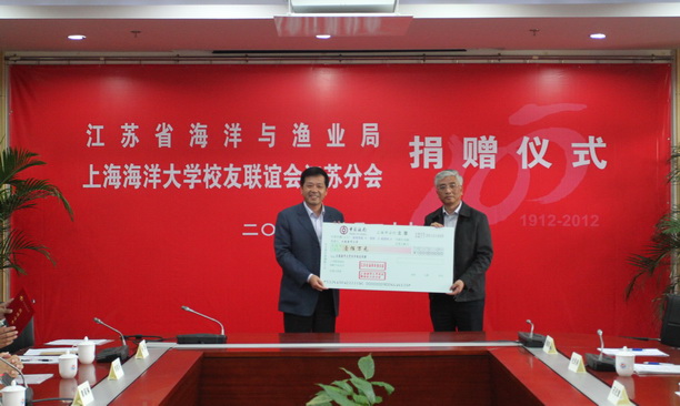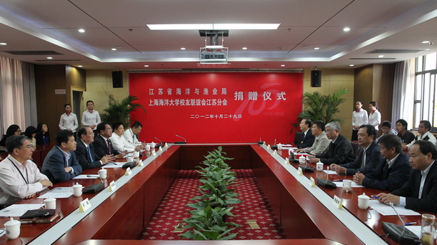 2012年10月29日上午,江苏省海洋与渔业局、上海海洋大学校友联谊会江苏分会捐赠仪式在我校隆重举行。出席会议的校领导有校长潘迎捷、校党委副书记吴嘉敏、副校长黄硕琳,校长助理、水产与生命学院院长李家乐,捐赠仪式由黄硕琳副校长主持。我校党委副书记吴嘉敏接受由江苏校友会捐赠的100万元。