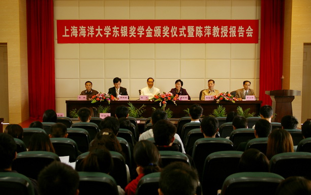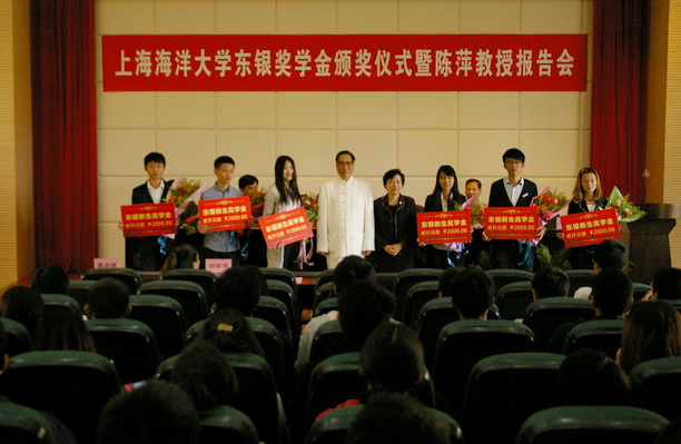 11月2日,喜迎海大百年华诞之际,上海海洋大学东银奖学金颁奖仪式暨陈萍教授报告会在水产与生命学院学术报告厅隆重举行。东银集团董事长陈萍先生,总经理陈裕龙先生及夫人何丽萍女士,校党委书记虞丽娟,校党委副书记、副校长、元鼎学院院长黄晞建,教务处副处长张帆,学生处副处长罗汝坤,教师代表及元鼎学院学员参加了颁奖仪式。仪式由学生处副处长罗汝坤主持。