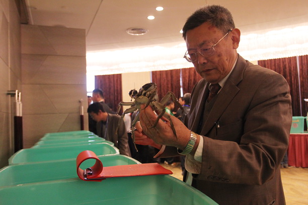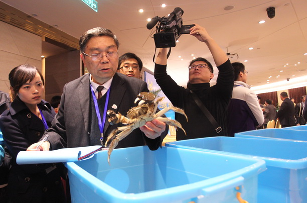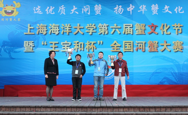 11月4日上午,由上海海洋大学主办的第六届蟹文化节暨“王宝和杯”全国河蟹大赛在分别在南京东路世纪广场和王宝和大酒店隆重举行,来自上海、江苏、浙江、河南和台湾等55家企业养殖的河蟹汇聚一堂,角逐一年一度的蟹王、蟹后头衔和金蟹奖、最佳种质奖、最佳口感奖。最终,由安徽安庆市皖宜季牛水产养殖有限责任公司选送的617.4克雄蟹和江西进贤皖赣特种水产开发有限公司选送的重达415.6克的雌蟹,分获 “蟹王”、“蟹后”称号;由江西国营九江县赛城湖水产场、东太湖徐福林和丰收蟹庄太湖养殖基地3家单位选送的蟹获“最佳口感奖”称号;由安庆市皖宜季牛水产养殖有限责任公司、江西军山湖生态农业发展有限公司和江苏省苏州市吴中区临湖现代渔业发展有限公司3家单位选送的蟹获“最佳种质奖”称号;首次参赛的台湾苗栗县政府、昆山淀山湖永兴虾蟹养殖农民专业合作社、霍邱县城东湖生态水产养殖有限公司等19家单位选送的蟹获“金蟹奖”称号。