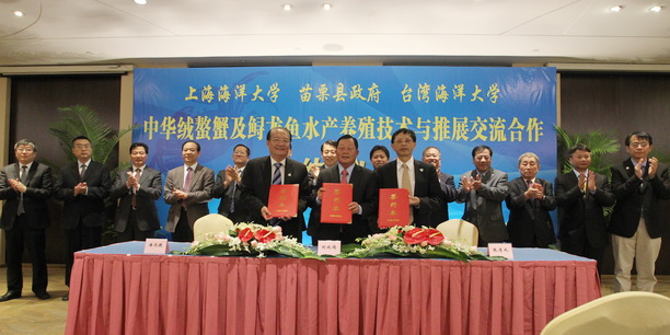 我校和苗栗县政府、台湾海洋大学举行中华绒螯蟹及鲟龙鱼水产养殖技术与推展交流合作签约仪式