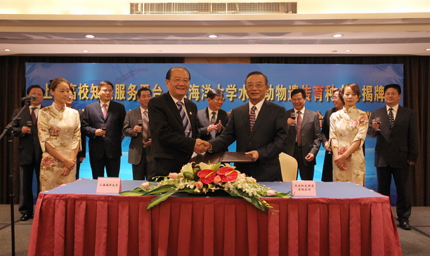 当晚,上海高校知识服务平台上海海洋大学水产动物遗传育种中心揭牌仪式暨上海海洋大学与上海王宝和大酒店有限公司战略合作签约仪式,以及我校和苗栗县政府、台湾海洋大学的中华绒螯蟹及鲟龙鱼水产养殖技术与推展交流合作签约仪式均在王宝和大酒店举行。