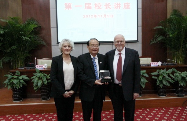 潘迎捷校长首先表示对Brian J. Rothschild教授一行的到来表示热烈欢迎,并介绍了第一届校长讲座的背景及其设想。潘校长强调在未来的20年里,上海海洋大学的目标是建设成为一所国际知名的高水平特色大学,为了实现这一目标,要不断派出优秀青年教师及学生到国外进修学习的同时,邀请高规格、高水平的国外专家和教授进行讲座。将校长讲座举办成为经典的、有特色的、能持续发展的讲座,给学校师生传授知识,加快我校学科专业的国际化进程。紧接着,潘校长为Brian J. Rothschild教授授牌,并赠予我校百年校庆纪念品。