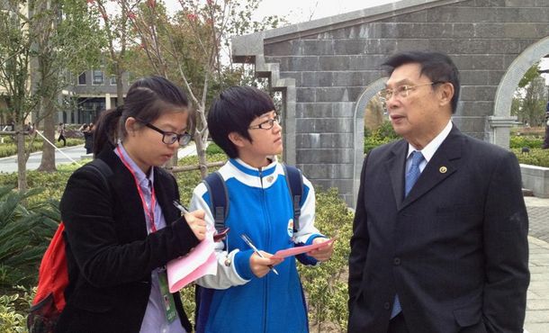 下午两点,张老在朝海路历史长廊前接受了校记者团采访。如今已84岁的张老身着笔挺的西装,意气风发,喜悦之情溢于言表。当被问及“张謇先生创办江苏省立水产学校的初衷”时,张老低头沉思了片刻,说道:“我的祖父张謇先生是一名状元,曾受到帝师翁同龢先生的赏识与指点。考取状元之后步入仕途,与清朝一些高层官员有所接触,深深体会到了成为强国对于一个国家来说的必要性,而想要成为一个强国,就必须要有教育这个基础。与此同时,他也较早地接触了西方的先进文化。在1894年,他下定决心汲取西方先进文化的精华以及教育知识。1903年,他亲自去日本考察70天。回国时,他带回了书、农具,还有一些建筑图纸,希望可以从中学习一些有助于国经济和教育家发展的东西。他也从中意识到了改革的重要性。同时,他也深刻地意识到了培养人才的必要性,所以,他积极兴办学校,培养师资,创办了江苏省立水产学校。”