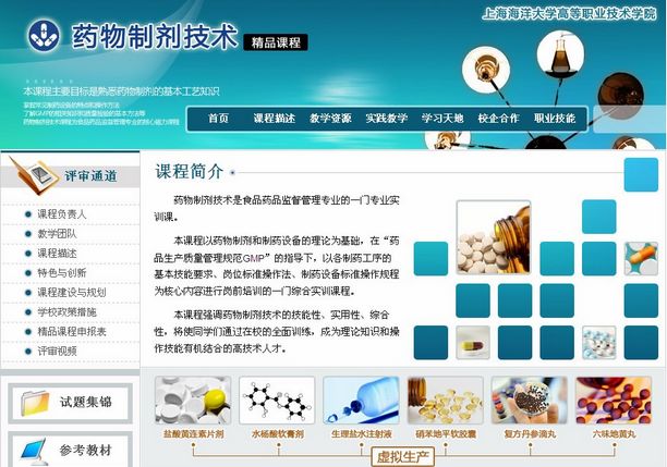 自2011年以来,在教学副院长金晔老师的带领下,不断整合教师队伍,充分利用上海市教委“食品药品监督管理公共实训基地建设项目”资源,学院开始按照市级精品课程要求建设“药物制剂技术”课程。为了使课程内容更符合药物制剂生产岗位工作,又突出高等职业教育实践性强的特点,课程建设人员吴文惠、张朝燕、于庆梅、张云、朱红霞等走访了上海信谊药业集团、上海禾丰制药集团等企业,与生产技术人员共同开发和建设课程。