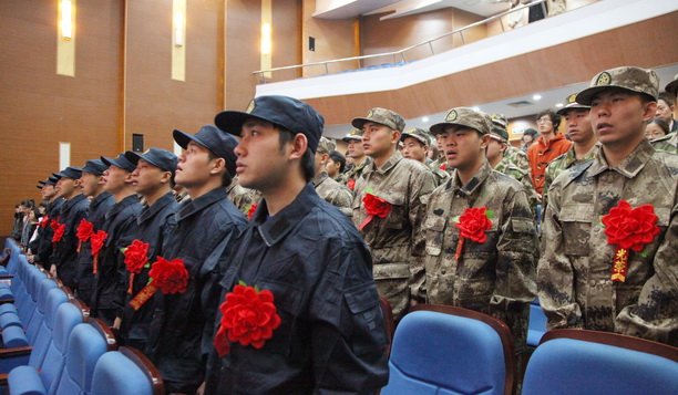 退伍学生代表,工程学院2007级机制5班孙凯同学在会上发言,感谢学校各级领导的关心和帮助,并介绍了自己在部队两年军旅生涯的经历和收获,最后向即将入伍的同学们介绍了经验并提出了希望。入伍学生代表、食品学院2011级建筑3班郭开强同学代表即将入伍的50名同学表达了自愿应征入伍,携笔从戎,立志到部队建功立业,为国防现代化建设作贡献的决心,同时也希望能到部队这个大熔炉里等到锻炼,丰富自己人生阅历。在校学生代表,食品学院袁渊同学以及入伍学生家长代表周永连分别发言,对即将离开海大校园,奔赴军营的海大学子寄予良好的祝愿。主席台领导为入伍学生佩戴大红花并颁发荣誉证书、并同退伍和入伍的学生合影留念。