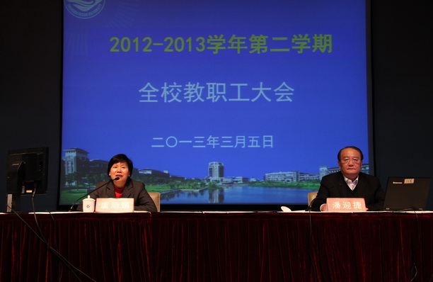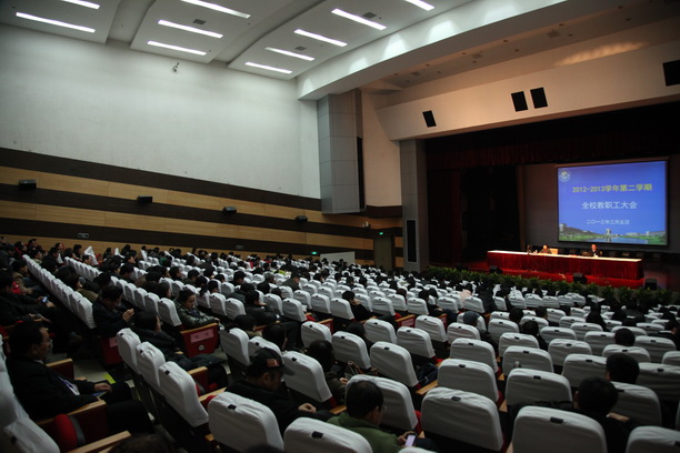 潘迎捷校长作了题为《承继百年伟业,加快转型发展,不断开拓创新,努力推进高水平特色大学内涵建设》的新学期开学报告。报告内容包括2012年的工作总结和部署2013年的主要工作两大部分。通过视频短片回顾了我校2012年各项工作取得的显著成效,2012年学校围绕“迎百年校庆、抓内涵建设”两大重点工作,学校有十个方面的工作亮点,取得了显著成效:成功举办百年校庆活动、优秀学生培养有新举措、学科建设取得新成绩、科研工作取得新突破、平台建设有新进展、师资队伍建设有新变化、服务社会有新拓展、素质教育取得新成效、校区功能有新完善、学校投入和教职工收入有较大增长。在肯定成绩的同时,潘校长指出,学校在制约发展的瓶颈问题没有得到根本转变、学科建设距离高水平特色大学目标还有较大距离、改革的力度和深度仍显不足。