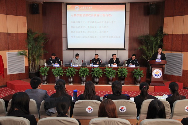 3月12日下午,元鼎学院思想政治素质培训班与浦东新区公安局合作的公民警校开班,同时也启动了元鼎学院思政班2013年的课程。临港高校派出所所长盛建平、副所长王建繁、浦东新区公民警校负责人朱震华、学生处副处长朱克勇、校团委书记夏雅敏、民警代表以及元鼎学院思政班全体学员参加了会议。