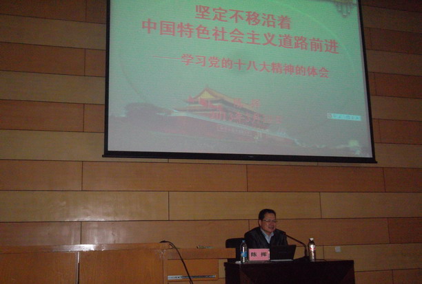 陈教授首先介绍了党和国家高层领导的新老交替和平稳过渡;然后通过视频、举例等方式,全面深入论述了十八大的主题,高举中国特色社会主义伟大旗帜,以邓小平理论、“三个代表”重要思想、科学发展观为指导,解放思想,改革开放,凝聚力量,攻坚克难,坚定不移沿着中国特色社会主义道路前进,为全面建成小康社会而奋斗。同时,他还简单介绍了十八大的新观点、新思路、新部署等,最后,陈教授和我们分享了学习十八大精神的启示——我们应该坚定不移走自己的路,坚持创新不动摇,永远同人民在一起,守望共产党人的精神家园。