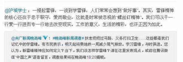 “一提起雷锋、一说到学雷锋,人们常常会想到‘做好事’。其实,雷锋精神的核心还在于忠于职守,爱岗敬业,这就是时常被忽视的‘螺丝钉精神’。我们可以干一行爱一行进而专一行地去改变现实。工作的意义,生活的精彩,也许正因为如此。”,这是微博名为“沪城学士”(http://weibo.com/dyulai1966)的我校教师在央广新闻晚高峰微博针对“当下,我们该怎样学雷锋?”讨论发布的一条微博。篇幅短小、内容简洁、一语中的的微评论向社会传递出一股正能量。
