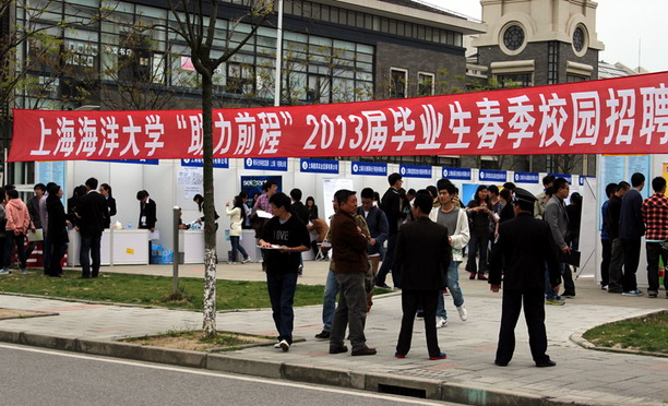 4月16日下午,上海海洋大学“助力前程”2013届毕业生春季校园招聘会在海星广场举行。本次招聘会吸引了上海统一星巴克咖啡有限公司、中国达能食品饮料有限公司、华伟表面处理技术(上海)有限公司、广发银行上海客维中心、上海市对外服务有限公司、上海长风海洋世界有限公司等88家用人单位前来参加,需求专业涉及工程、机械、生物、贸易、信息、管理、养殖及动物科学等多个领域,提供了近1500个就业岗位。