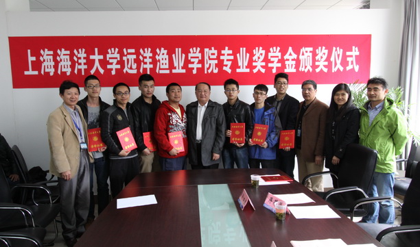 2013年4月19日下午,上海海洋大学校长、远洋渔业学院院长潘迎捷教授在海洋科学学院B207会议室为即将远航的远洋渔业学院第一期学生颁发远洋渔业学院专业奖学金。仪式由远洋渔业学院副院长沙锋主持。