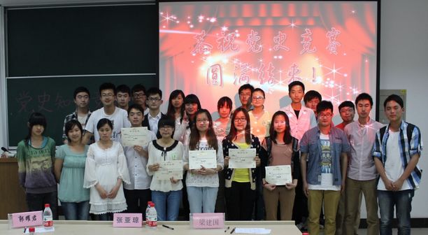 通过前期初赛的激烈角逐,最终有十位入党积极分子晋级今天的决赛。决赛环节由是非题、选词答题、你画我猜以及红歌猜猜猜四个部分组成,答题过程中,各选手反应敏捷、回答迅速、妙趣横生,台下的观众也积极互动,使得现场气氛异常火热,尤其是在选词答题环节,台下的观众作为选手后援团争相帮助选手抢答问题,把满腔的爱国主义精神和坚定信念永远跟党走的理想斗志发挥的淋漓尽致,而红歌猜猜猜环节更将本次比赛推向高潮,在优美的红歌声中,聆听、回忆党的光辉历史。在四轮紧张激烈的比拼后,最终2010级薛羡沁同学脱颖而出获得一等奖,柳先娜、阳顺恒、刘晏欣三位同学分获二、三等奖,由相关老师及学生党支部书记为其颁发了证书及奖品并合影留恋。