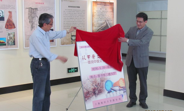 5月17日下午,随着第七届“读书•文化”节最后一场活动“从甲骨文到电子书——图说中国文字载体的变迁”展览在图书馆三楼大厅的揭幕,上海海洋大学第七届“读书•文化”节也降下了帷幕。程裕东副校长、图书馆领导以及图书馆各部室主任、部分学生代表等出席了展览揭幕仪式。