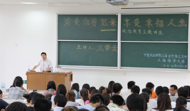 为进一步落实上海市教育委员会、中国人民银行上海分行关于开展高校学生资助诚信教育主题活动的要求,同时也为了进一步做好毕业生国家助学贷款相关工作,6月8日下午,校学生处学生资助中心邀请中国农业银行上海市分行南汇支行个贷中心王荣云经理为2013届部分毕业生代表做了“珍爱信用记录,享受幸福人生”的主题讲座,校学生资助中心全体工作人员、各学院负责国家助学贷款的辅导员老师及各学院2013届毕业生代表200余人参加了此次讲座。